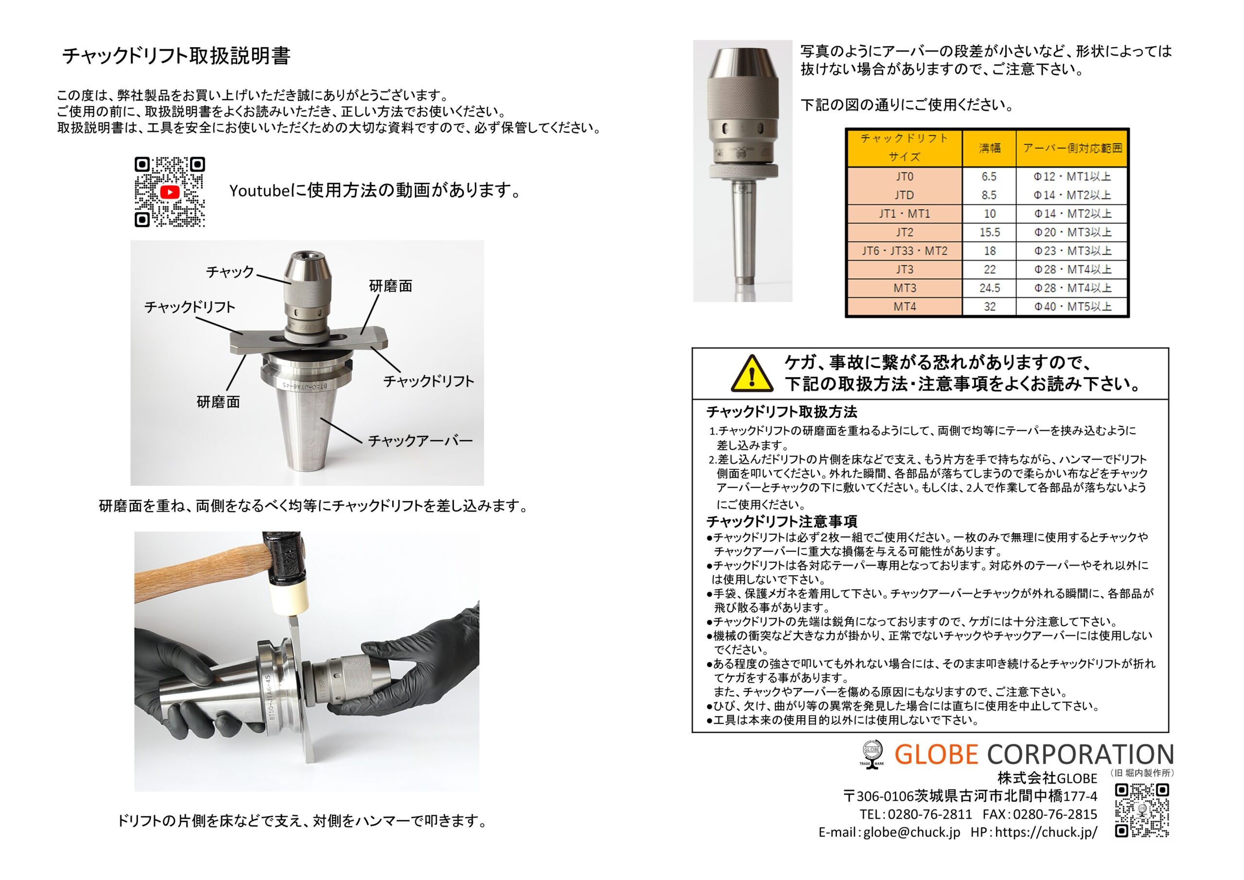 従来、ナット付きアーバー以外では、キーレスドリルチャックの取り外しは困難とされてきましたが、本製品「チャックドリフト」をご使用いただくことで、テーパー部を傷めることなく、アーバーやボール盤主軸からチャックを簡単に取り外すことが可能です。