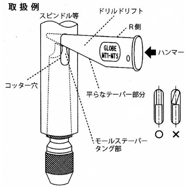 ドリルドリフトのテーパー部にある平らにカットされた面を、モールステーパーのタング側に向けて、上図のようにコッター穴へ差し込んでください。