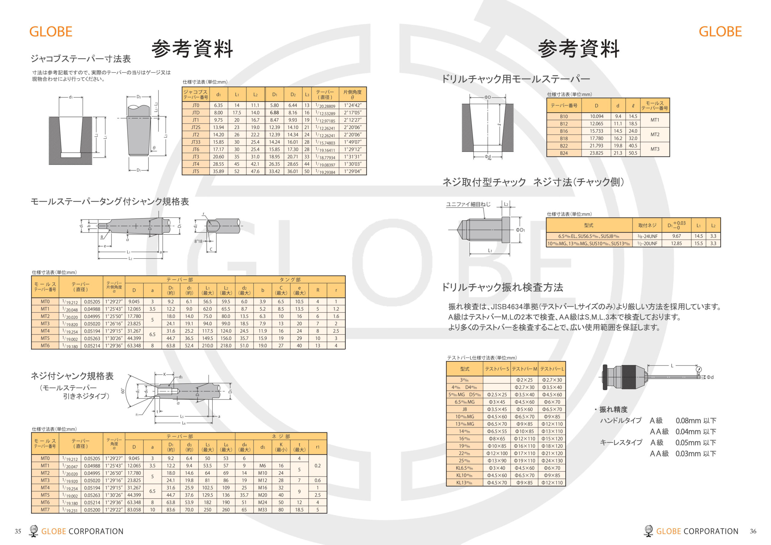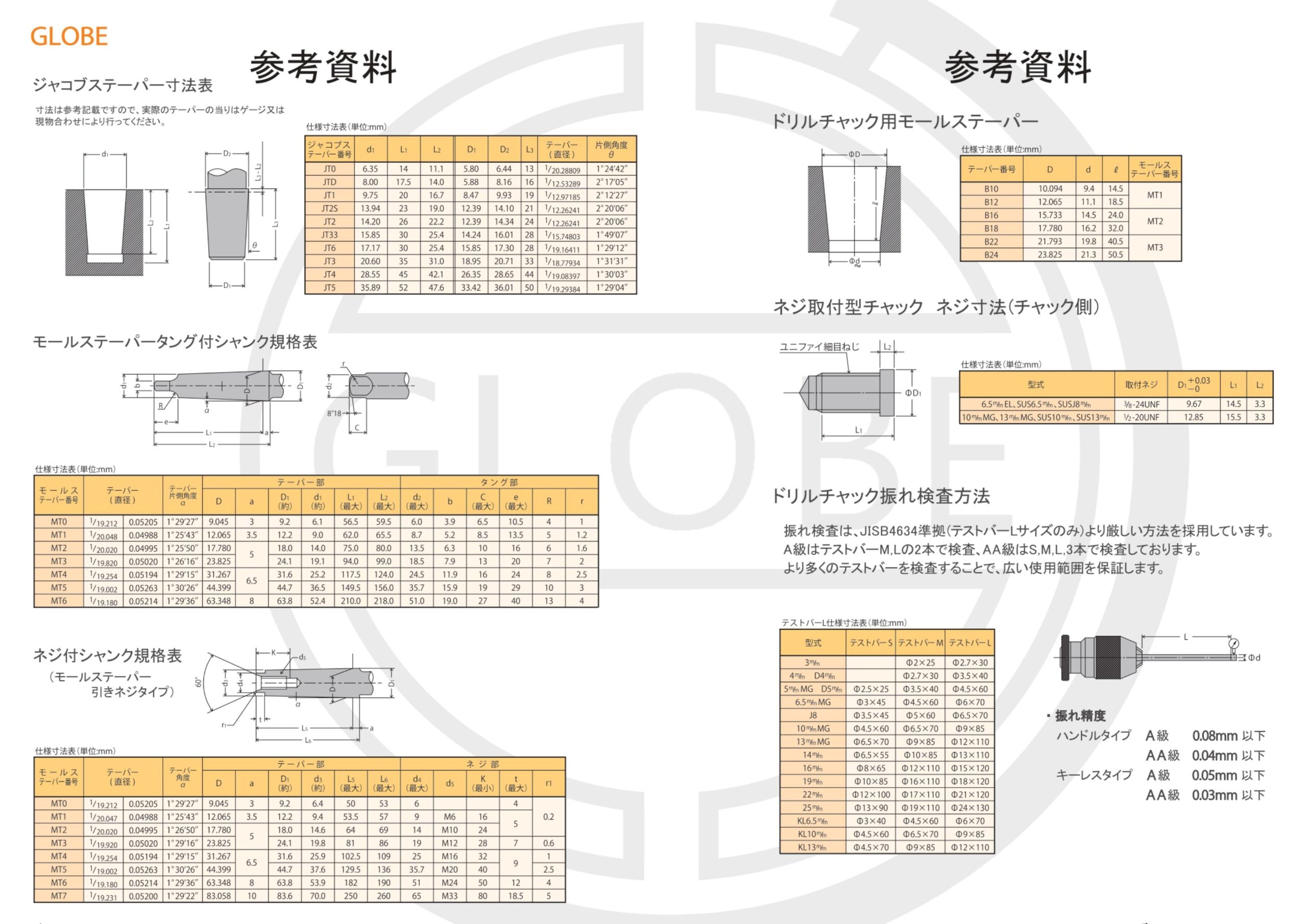| 種類 | JIS規格の振れ精度 | GLOBEハンドル式ドリルチャックの振れ精度 | |