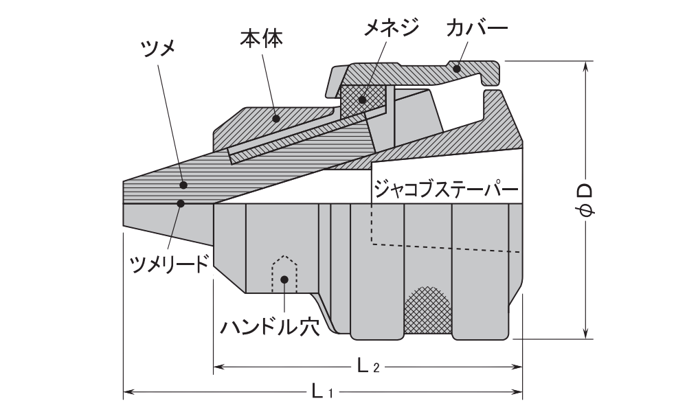 | 型式 | 標準 使用範囲 | 小径用使用範囲 | 標準取付け形式 | 適合 ハンドル | ハンドル 穴径 | D | L₁ | L₂ | ツメリード | 重量(g) 本体 | 標準以外のテーパ | ステンレス製 |