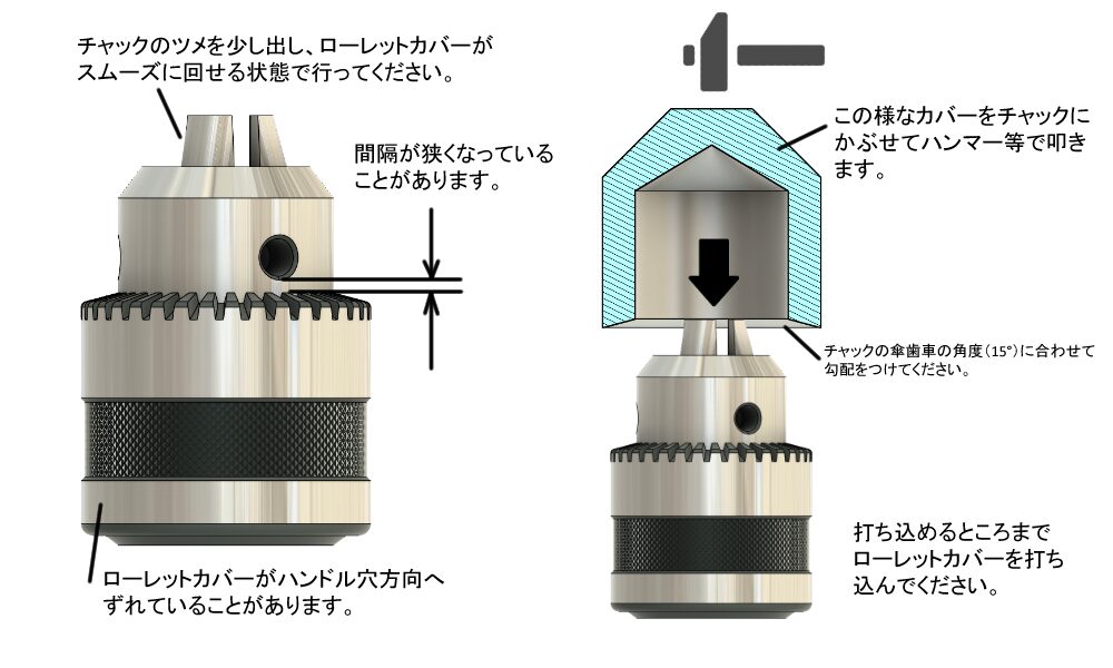 長年ご使用いただいているドリルチャックでは、ローレットカバーがずれてしまう場合がございます。